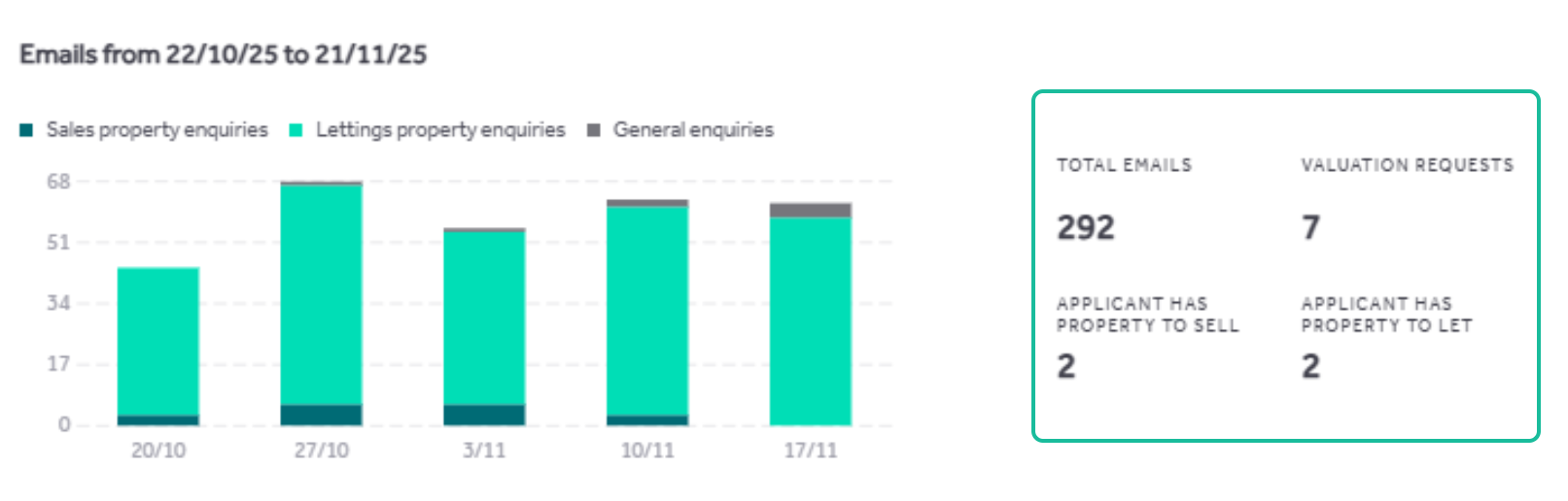 The graph will give a breakdown of all emails, broken down into Sales, Lettings and General Enquiries.