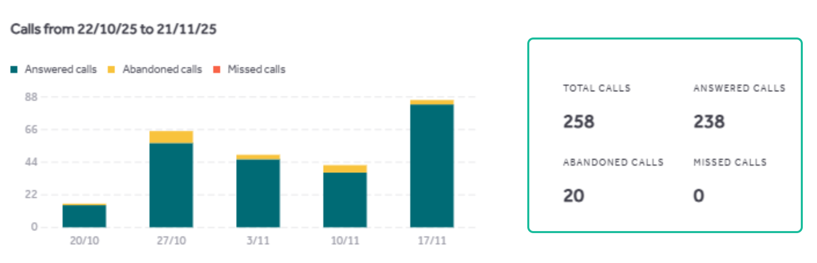 The graph will give a breakdown of all calls made to the Rightmove GEO number, broken down into answered, missed and abandoned calls. This is also detailed on the panel on the right, as shown below: