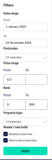 On the filters section, you can update the date range, postcodes, price range, bedroom amount, property types, and resale/new build properties: